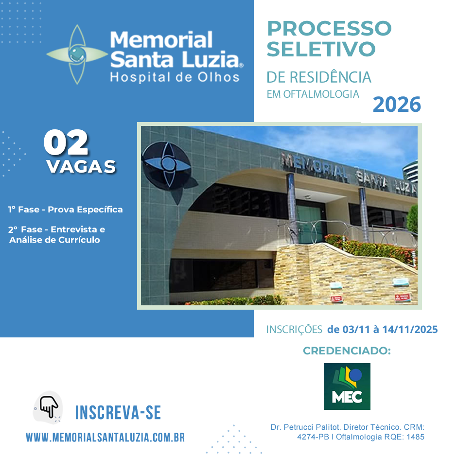 O MEMORIAL SANTA LUZIA HOSPITAL DE OLHOS, no uso de suas atribuições legais, torna público que estarão abertas as inscrições para a realização do Processo Seletivo para o preenchimento de vaga no Curso RESIDÊNCIA MÉDICA do Memorial Santa Luzia credenciado pelo MEC – Ministério da Educação
